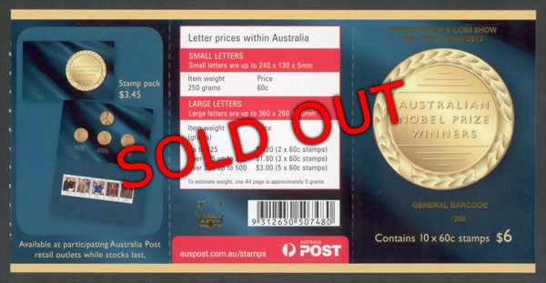 2012 $6.00 Australian Noble Prize Winners self adhesive booklet & 2012 Inland Explorers Miniature Sheet overprinted "PERTH STAMP & COIN SHOW 6th-7th October 2012" in gold. Limited to only 100 and each individually numbered.