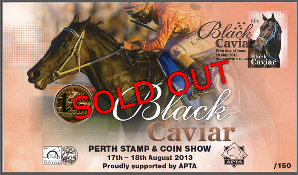 2013 Black Caviar $1 PNC FDC overprinted "PERTH STAMP & COIN SHOW 17th-18th August 2013 Proudly supported by APTA" with both the PS&CS & APTA logos. Limited to only 150 and each individually numbered.