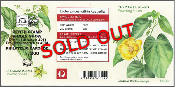 2013 $6.00 Christmas Island Flowering Shrubs self-adhesive booklet & 2013 Headline News Miniature Sheet overprinted "PERTH STAMP & COIN SHOW 17th-18th August 2013" with both the PS&CS & APTA logos. Limited to only 200 and each individually numbered.