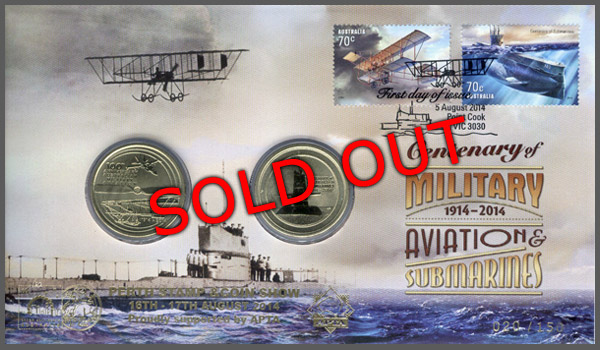 2014 Centenary of Military Aviations & Submarines 1914 - 2014 PNC overprinted "PERTH STAMP & COIN SHOW 16TH - 17TH AUGUST 2014" with both PS&CS & APTA logos. Limited to only 150 and each individually numbered.