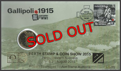 2015 Gallipoli Centenary – Simpson & his donkey PNC overprinted "PERTH STAMP & COIN SHOW 2015 Perth, Western Australia 1st & 2nd August 2015 Proudly Sponsored by Ace Stamp Auctions” overprinted with both PS&CS & Ace Stamp Auctions logos. Limited to only 75 and each individually numbered by hand.