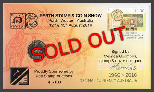 2016 50th Anniversary of Decimal Currency PNC overprinted "PERTH STAMP & COIN SHOW Perth, Western Australia 12th & 13th August 2016 Proudly Sponsored by Ace Stamp Auctions" overprinted with both PS&CS & Ace Stamp Auctions logos. Also for the first time we have had each cover individually autographed. It has been signed by Melinda Coombes, the $1 stamp and cover designer. Limited to only 100 and each individually numbered by hand.