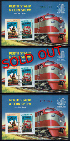 2017 PERTH STAMP & COIN SHOW 7-9 JULY 2017 Trans-Australian Railway 100th Anniversary imperforate miniature sheet with exhibition logo and postmarked on each day of the show. Limited to 100 sets only. Price: $15/set |