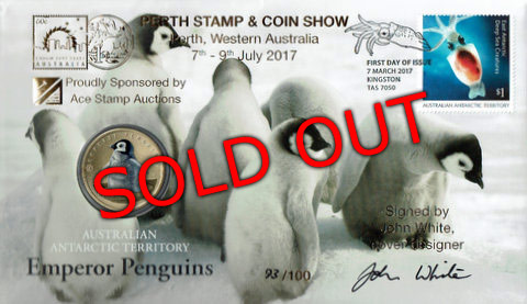 2017 Australian Antarctic Territory Emperor Penguins PNC overprinted "PERTH STAMP & COIN SHOW Perth, Western Australia 7th - 9th July 2017 Proudly Sponsored by Ace Stamp Auctions" with both PS&CS & Ace Stamp Auctions logos. Each has been individually autographed by the cover designer, John White. This is the first AAT PNC and has a matching coloured $1 coin. Limited to only 100 with each individually numbered by hand, order early to avoid disappointment.