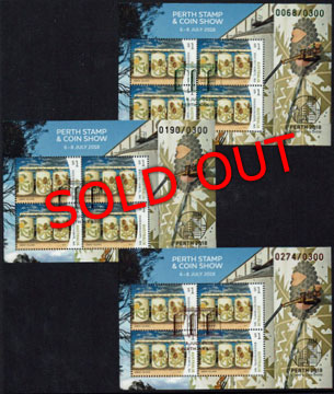 2018 PERTH STAMP & COIN SHOW 6-8 JULY 2018 Silos miniature sheet with exhibition logo and postmarked on each day of the show. Limited to 100 sets only with each individually numbered in same colour as postmark. |