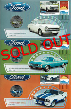 2018 Ford Cortina/Fairlane/Cobra PNC’s cancelled "PERTH STAMP & COIN SHOW" with the customary green postmark for the opening day, black for Saturday and red for the closing day. Each contains the matching commemorative coloured coin for each car. These will be numbered & limited to 100 per each day of the exhibition. |