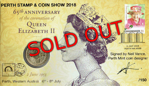 2018 65th Anniversary QEII Coronation PNC overprinted "PERTH STAMP & COIN SHOW Perth, Western Australia 6th - 8th July 2018” with both PS&CS logo. Each has been individually autographed by the Perth Mint coin designer, Neil Vance. This is the first PNC we have produced signed by the coin designer of the featured coin in the actual PNC. Limited to only 150 with each individually numbered by hand, order early to avoid disappointment.