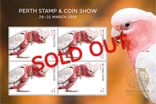2019 (29th -31st March) Perth Stamp & Coin Show 2018 Special Galah miniature sheet containing block of 4 x $1 from the fauna issue with show dates & logo. Limited-edition and numbered versions of this minisheet will feature a coloured daily postmark. Day 1 and Day 3 minisheets are limited to 120. On Day 2, a special "am" and "pm" postmark will be used, with those minisheets limited to 90 of each. Only one limited-edition minisheet per customer per day. Price $8 each, $32 per set of 4 |