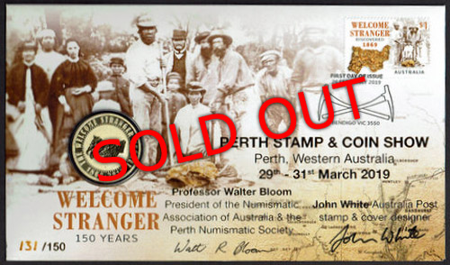 2019 150th Anniversary "Welcome Stranger" Gold Nugget Discovery $1 Perth Mint PNC overprinted "PERTH STAMP & COIN SHOW Perth, Western Australia 29th – 31st March 2019". Each has been individually autographed by the Australia Post stamp and cover designer, John White and the President of the Numismatic Association of Australia & the Perth Numismatic Society, Professor Walter Bloom. Limited to only 150 with each individually numbered by hand, order early to avoid disappointment.