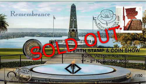 2019 (1st November) Remembrance $1 Royal Australian Mint PNC overprinted "PERTH STAMP & COIN SHOW Perth, Western Australia 1st – 3rd November 2019" with the show logo below the coin. $1”Tomb of the Unknown Soldier” stamp postmarked with poppy pictorial Perth cancel. Limited to only 150 with each individually numbered by hand, order early to avoid disappointment