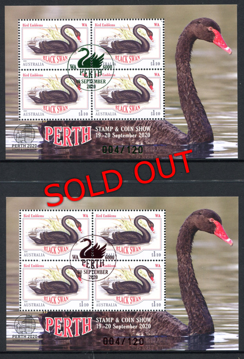 PERTH STAMP & COIN SHOW 19-20 SEPTEMBER 2020 $4.40 Black Swan miniature sheet with exhibition logo and postmarked on both days of the show. Limited to 120 pairs only with each individually numbered in same colour as postmark.