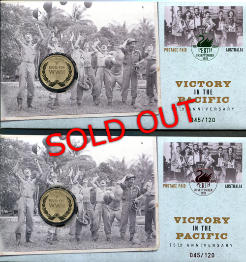 PERTH STAMP & COIN SHOW 19-20 SEPTEMBER 2020 "Victory in the Pacific 75th Anniversary" $1 RAM "End of WWII" coin PNC's pair cancelled with the customary green postmark for the opening day and red for the closing day. These are individually numbered in matching red or green & limited to 120 per day.