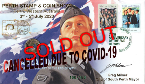 2020 (3rd July) Anzac Day 75th Anniv of the End of WWII $2 Royal Australian Mint PNC overprinted "PERTH STAMP & COIN SHOW Perth, Western Australia 3rd – 5th July 2020" with the show logo above the coloured coin. South Perth 615 postmark in green tying pair of $1.10 WWII commemorative stamps. Signed by Greg Milner, City of South Perth Mayor. "CANCELLED DUE TO COVID-19" overprinted in red due to the show having to be postponed due the Corona Virus. Limited to only 150 with each individually numbered.