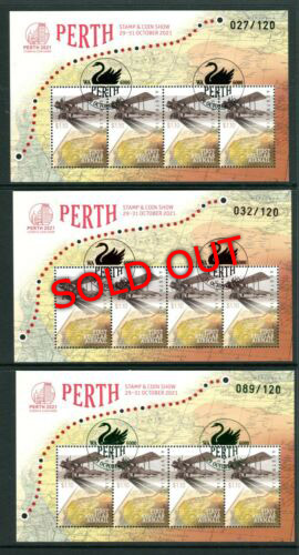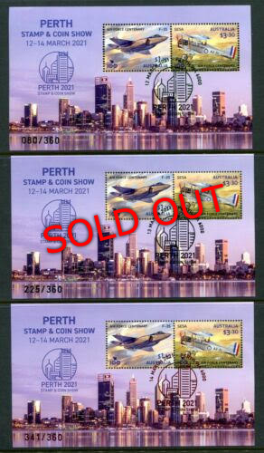 PERTH STAMP & COIN SHOW 12-14 MARCH 2021 $4.40 RAAF Anniv & Perth Skyline miniature sheets with exhibition logo and postmarked on each of the 3 days of the show. Limited to 120 per day with each individually numbered in same colour as the postmark.