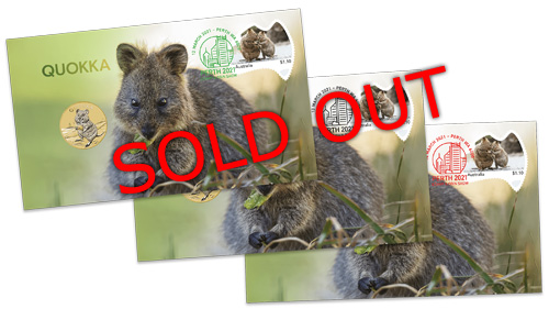 PERTH STAMP & COIN SHOW 12-14 MARCH 2021 "Quokka" set of 3 PNC's with $1 Perth Mint Quokka coins and cancelled with the customary green postmark for the opening day and red for the closing day on $1.10 Personalised Quokka stamps. These are individually numbered in matching green, black & red & limited to 120 per day.