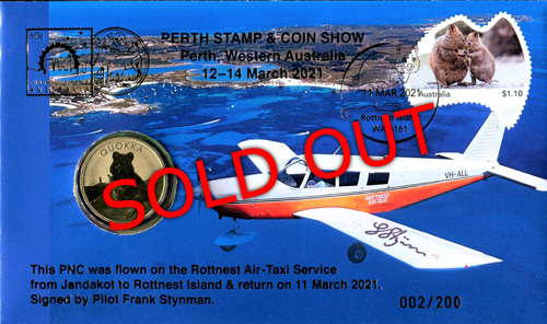 2021 (11th March) Quokka $1 Perth Mint PNC overprinted "PERTH STAMP & COIN SHOW Perth, Western Australia 12th – 14th March 2021" & "This PNC was flown on the Rottnest Air-Taxi Service from Jandakot to Rottnest Island & return on 11 March 2021. Signed by pilot Frank Stynman" with the show logo in gold. Pilots signature on the wing of the illustrated plane. Rottnest Island 6161 postmark in gold tying $1.10 Quokka personalised stamp. Limited to only 200 with each individually numbered.