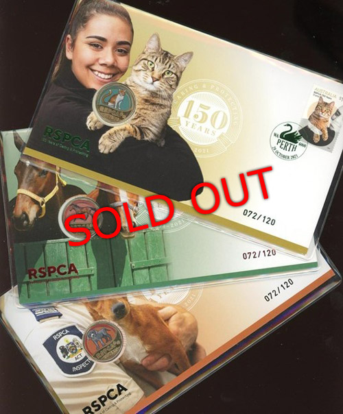 PERTH STAMP & COIN SHOW 29-31 OCTOBER 2021 RSPCA set of 3 PNC's with RAM $1 RSPCA coloured coins and cancelled with the customary green postmark for the opening day and red for the closing day on matching $1.10 stamps for Cats, Dogs & Horses. These are individually numbered in matching green, black & red & limited to 120 per day.