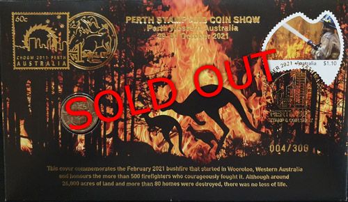 2021 (29th October) $1.10 Bushfire Firefighting Australia shaped pre-printed commem tied by Perth WA 6000 postmark in gold on kangaroo & fire illustrated PNC with RAM $2 "Firefighters" coin. Cover overprinted "PERTH STAMP & COIN SHOW Perth, Western Australia 29 – 31 October 2021" & "This cover commemorates the February 2021 bushfire that started in Wooroloo, Western Australia and honours the more than 500 firefighters who courageously fought it. Although around 26,000 acres of land and more than 80 homes were destroyed, there was no loss of life." In gold. Limited to only 300 with each individually numbered.
