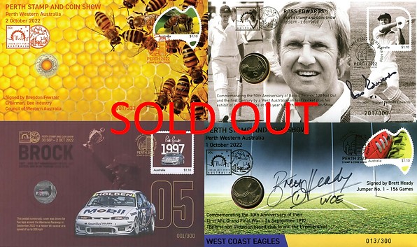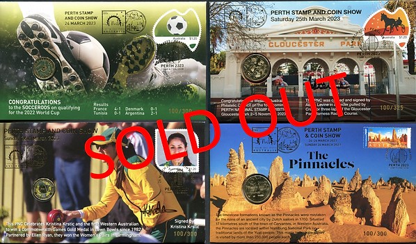 | We are delighted to present you with the Perth Stamp & Coin Show PNC set of 4 to be released in conjunction with the show from Friday 7th to Sunday 9th March. We have detailed these issues below. Limited to only 300 sets, you can see, we have tried to continue our association with Perth & Western Australian linked themes. This set of 4 is priced at $270 and will be sold with matching numbers. (Please note these images do not reflect the actual gold foil or the relevant signatures) | |