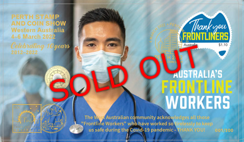 2022 (4th March) $1.10 "Thank you FRONTLINERS" Australia shaped pre-printed commem tied by Perth WA 6000 postmark in gold on hospital worker illustrated PNC with RAM $2 "Australia's Frontline Workers" coin. Cover overprinted "PERTH STAMP AND COIN SHOW Western Australia 4 – 6 March 2022 Celebrating 10 years 2012-2022" & "The West Australian community acknowledges all those "Frontline Workers" who have worked so tirelessly to keep us safe during the Covid-19 pandemic – THANK YOU!" In gold. Limited to only 300 with each individually numbered.