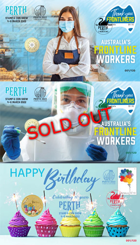 PERTH STAMP & COIN SHOW 4-6 March 2022 set of 3 PNC's with two different "Frontliners" illustrated covers each containing RAM $2 Frontline Workers coloured coins and cancelled with the customary green postmark for the opening day and black for day 2 with Day 3 being the "Happy Birthday" $1 Perth Mint coloured coin celebrating the shows 10th year & postmarked in red for the closing day. Limited to 120 per day.
