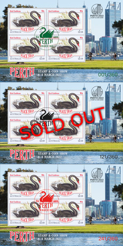 PERTH STAMP & COIN SHOW 4-6 MARCH 2022 $4.40 Black Swan with Perth skyline miniature sheets postmarked on each of the 3 days of the show. Limited to 120 per day with each individually numbered in the same colour as the postmark. |