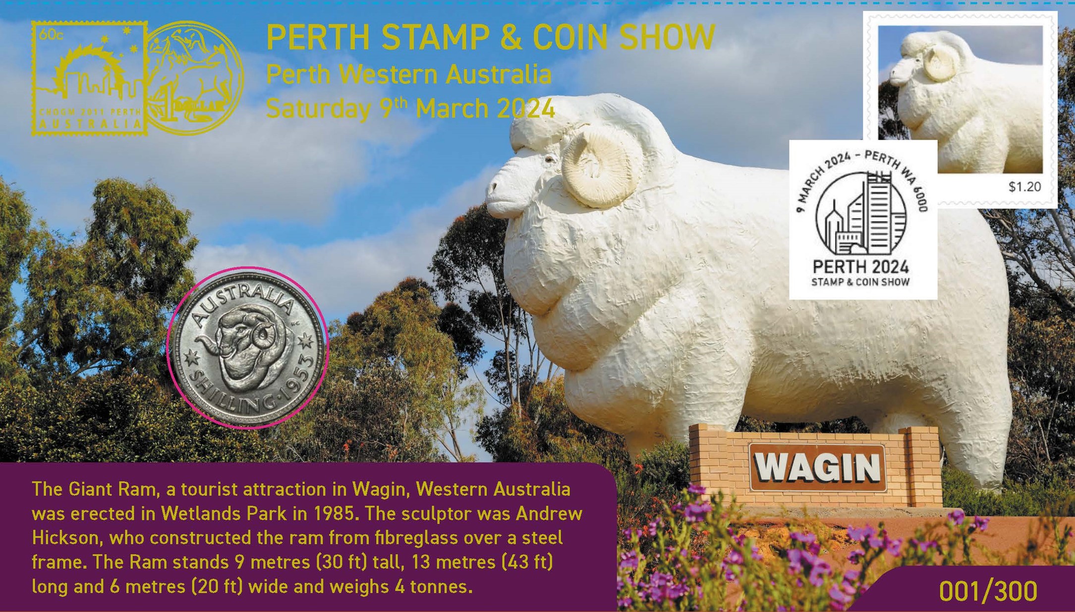 Day 2 Saturday 9th March 2024 The Giant Ram is located in Wagin, WA and we believe this to be the first PNC containing an Australian pre-decimal silver coin, being the 1/- "Ram" with the Ram MyStamp postmarked by the pictorial show cancel. Price $