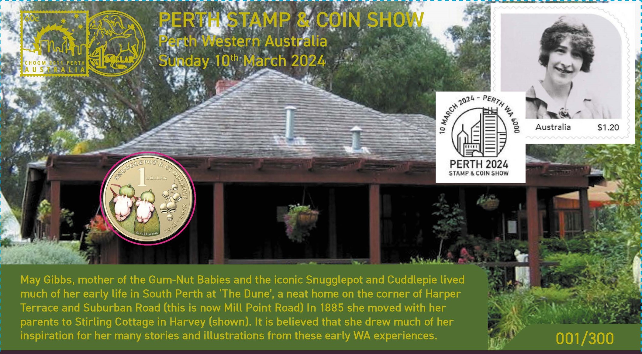 Day 3 Sunday 10th March 2024 May Gibbs, mother of the Gum-Nut Babies and the iconic Snugglepot and Cuddlepie lived much of her early life in South Perth hence our recognition of this as the location of our annual show. The PNC incorporates the 2018 $1 Snugglepot & Cuddlepie coloured coin with a MyStamp of May Gibbs. Price $