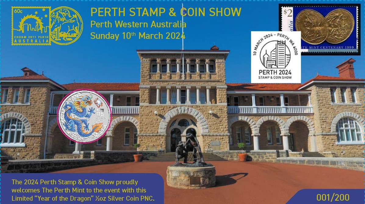 Day 3 Sunday 10th March 2024 The Perth Mint We are thrilled to welcome them to this years event. Limited to just 200, this PNC features the 2024 ½oz silver Lunar New Year Blue Dragon coloured coin with the iconic Perth Mint building illustrated on the cover with the 1999 matching $2 embellished Perth Mint Centenary stamp, a stunning PNC! Price $