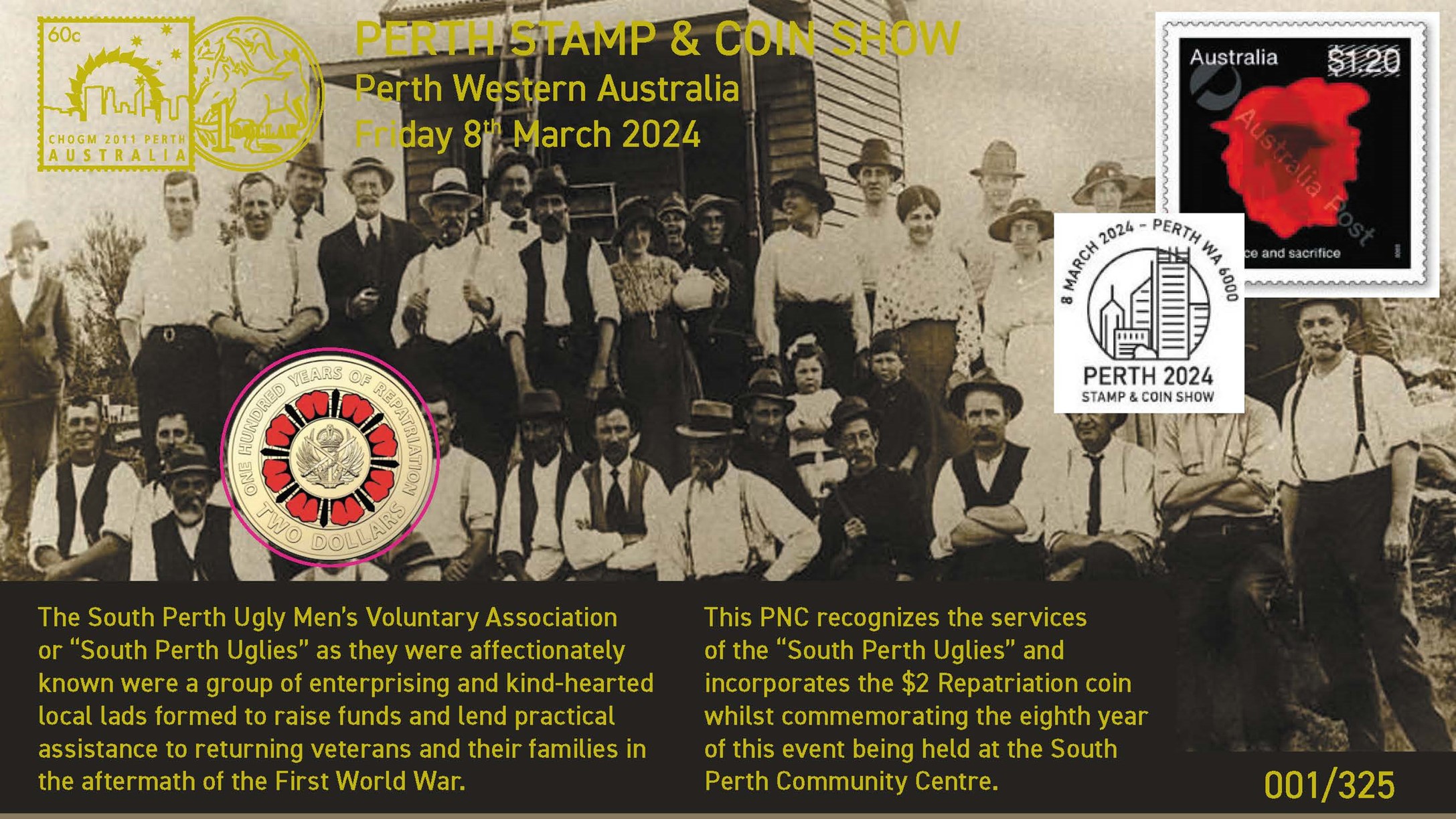 Day 1 Friday 8th March 2024 The "South Perth Uglies" with the 2019 $2 Repatriation coloured coin & $1.20 Remembrance Day Poppy stamp cancelled with the Exhibition postmark. Price $