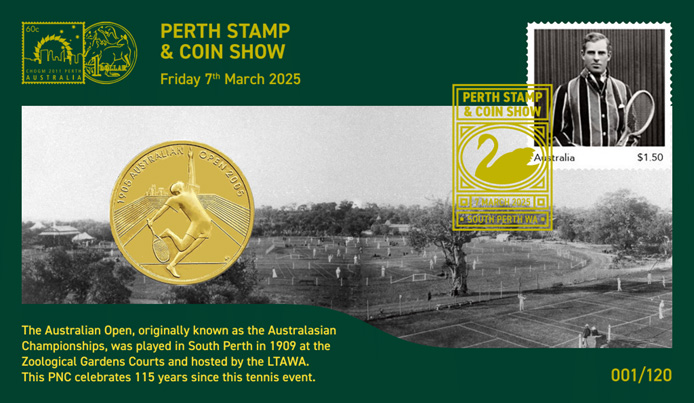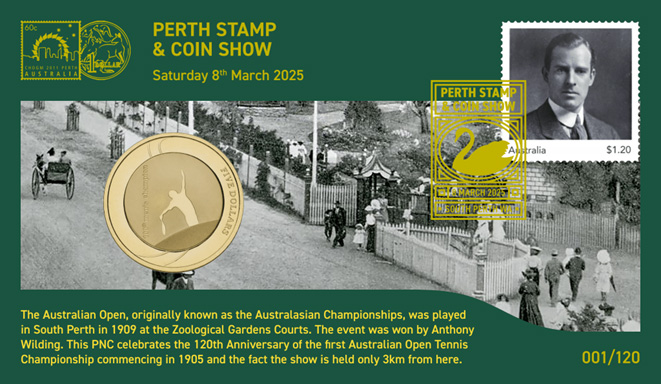 DAILY PNC's CELEBRATING THE 1909 AUSTRALIAN OPEN IN SOUTH PERTH – SET OF 3 Unfortunately, Australia Post will not be attending this years show. Their new management has decided that, due to overheads and staffing issues, it's no longer viable to participate. This is particularly surprising given their strong sales over the last decade. While it's disappointing, we’re doing our best to continue supporting the enthusiasm of the PNC collectors attending the event each day. To that end, we will be issuing a daily PNC limited to 120 and commemorating the fact that the "Australian Open", previously the "Australasian Championships" was held down the road at The South Perth Zoo in 1909! Each days PNC will contain a $5 Australian Open Tennis Coin including Day 3 with the ½oz silver Perth Mint coloured Grand Slam commemorative coin with a "MyStamp" and the 1992 45c New Zealand featuring Anthony Wilding, the winner that year, both tied by a pictorial dated cachet. Priced at $50 each for the first 2 days and $120 on Day 3 with the coin now retailing at more than the cost of the cover, these are sure to be popular. These will only be available to those in the queue each morning at 10.00am and NOT available by mail order. We illustrate them here for your reference and if not present at the show, maybe you know a Perth local who is willing to attend on your behalf! |