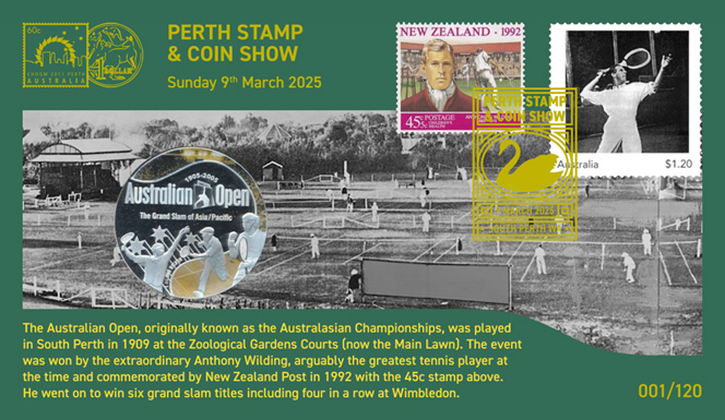 The Australian Open, originally known as the Australasian Championships, was played in South Perth in 1909 at the Zoological Gardens Courts and hosted by the LTAWA. This PNC celebrates 115 years since this event. Price $50