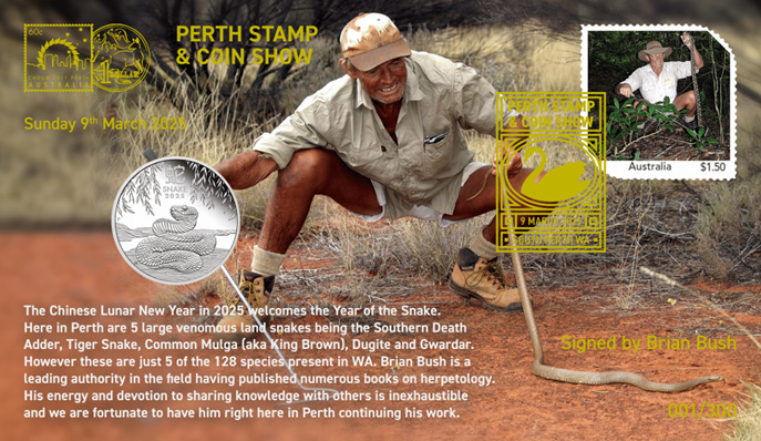 Day 3 Sunday 9th March 2025 The Chinese Lunar New Year in 2025 welcomes the Year of the Snake. This PNC contains the 2025 ½oz Perth Mint silver commemorative coin and signed by Perth's own Brian Bush, a leading authority in the field of herpetology while the $1.50 MyStamp shows Brian in action. Price $