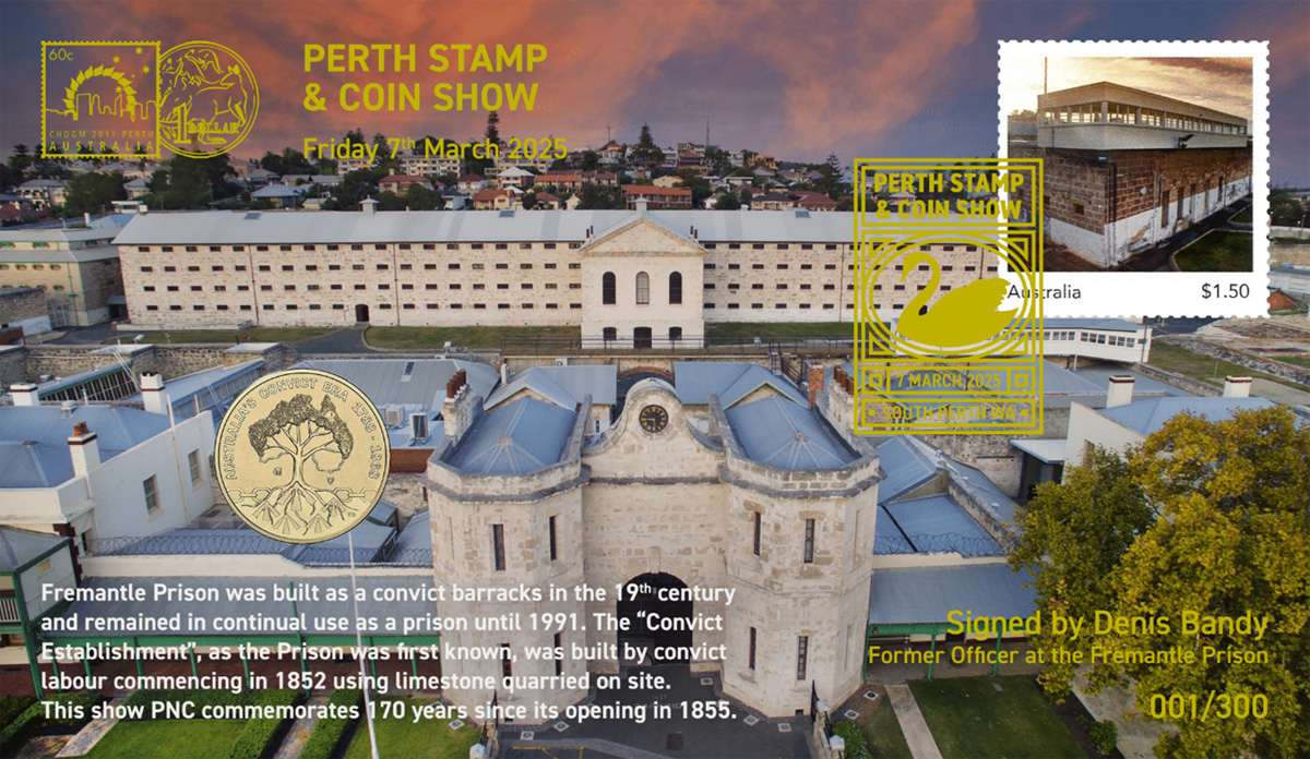 Day 1 Friday 7th March 2025 Fremantle Prison PNC commemorating 170 Years since its opening in 1855 and containing the 2018 $1 Convict Era coin. This is signed by Denis Bandy, a former prison officer at this iconic building. The attractive dusk arial photo appears on the cover while an internal scene on the $1.50 MyStamp cancelled with the dated show cachet in gold reflects its historical past. Price $