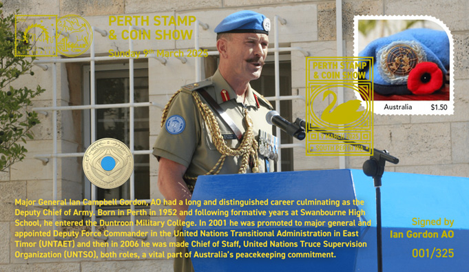 Day 3 Sunday 9th March 2025 Peacekeeping. Major General Ian Campell Gordon has signed these covers. Perth born and educated, he progressed through the army leading various peacekeeping missions ultimately becoming Deputy Chief of Army. The blue 2023 $2 Peacekeeping coloured coin & $1.50 Peacekeeping beret MyStamp tied by the PS&CS cachet in gold make this a stunning cover. Price $