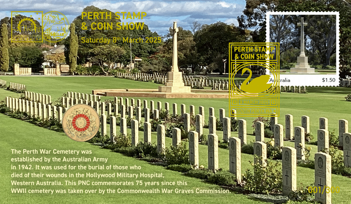 Day 2 Saturday 8th March 2025 Perth War Cemetery This PNC commemorates 75 years since this WWII cemetery was taken over by the Commonwealth War Graves Commission & includes the 2015 $2 War Graves Remembrance coin with the $1.50 Cemetery Memorial Cross MyStamp. Price $